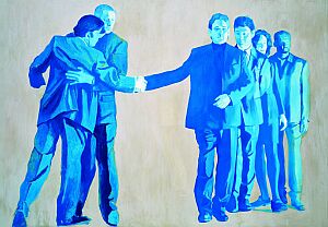 Paintings 10. September - 22. Oktober 2005 Die Londoner Künstlerin Joanna Price beschränkt sich in ihrer figurativen Malerei auf eine Farbskala aus Blau und Weiß. In diesem Farbspektrum modelliert sie zum einen nuanciert ihre Figuren, zum anderen erzielt sie durch diese Konzentration eine beinahe monochrome Wirkung. Die scharf umrissenen Figuren tanzen über die Bildfläche, kämpfen miteinander oder stehen als Zuschauer distanziert im Hintergrund. Das ist eine Ölmalerei, die die Tradition und die narrative Qualität dieses Genres für ihre Zwecke zu nutzt und dabei Anklänge an das reiche, dichte Turquoise eines Poussin ebenso wenig leugnet wie an die dekorative Wirkung blau-weißer Keramik. Joanna Price ist eine Meisterin in der Suggestion von Stofflichkeiten und inszeniert in ihrer Malerei die Kontraste zwischen punktuell grellem Lichteinfall und sanft verschatteten Partien, etwa in den Faltenwürfen zeitgenössischer Anzüge. Die damit erzielte Wirkung ist im Wortsinn theatralisch, und so zeigt diese erste Ausstellung der Künstlerin in München ein Bild aus den 90er Jahren, das sich explizit auf eine Szene aus der „Birthday Party“ des britischen Autors Harald Pinter bezieht, in der der Protagonist Stanley von zwei seltsamen Besuchern zu Boden gestreckt und dort festgehalten wird. Bedrohlich und amüsant zugleich, verharren die drei Akteure wie erstarrt mitten in der bewegten Handlung. |